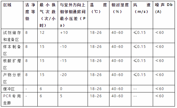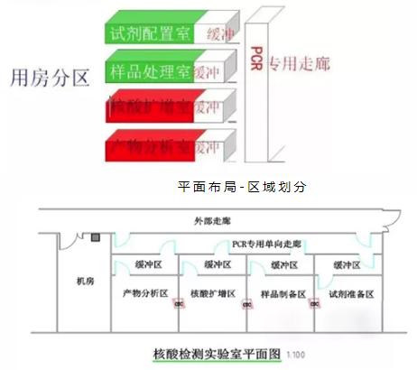 實(shí)驗(yàn)室通常分為四個(gè)區(qū)域,即:試劑準(zhǔn)備區(qū)、樣品制備區(qū)、核酸配制和擴(kuò)增區(qū)、產(chǎn)物分析區(qū)(如使用全自動(dòng)分析儀,區(qū)域可適當(dāng)合并)。