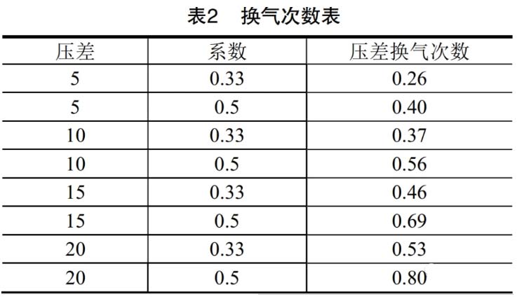 有些項目僅僅按照換氣次數(shù)法計算滲透風(fēng)量(見表1、表2),而忽略其他因素,筆者認(rèn)為合理的方法應(yīng)是綜合計算房間圍護(hù)結(jié)構(gòu)滲透風(fēng)量和門的滲透量;這樣才能保證正確的房間壓差平衡和變風(fēng)量閥選型,有利于正確的風(fēng)機(jī)風(fēng)量選型。