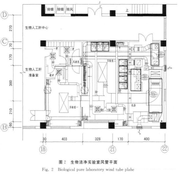 生物潔凈實(shí)驗室設(shè)實(shí)驗室1(用于動物解剖取肝)、實(shí)驗室2(用于人工肝實(shí)驗)及其相應(yīng)的輔助用房。實(shí)驗人員通過一更、二更經(jīng)風(fēng)淋后進(jìn)入實(shí)驗室,由緩沖經(jīng)一更離開實(shí)驗室;物品則通過傳遞窗進(jìn)出。人物分流、潔污分流的合理布局,避免了交叉感染,從客觀條件上提高了實(shí)驗數(shù)據(jù)的精確性。實(shí)驗室1、實(shí)驗室2中心區(qū)域設(shè)置百級送風(fēng)天花,實(shí)驗室2根據(jù)需要另設(shè)兩個百級層流工作臺送風(fēng)罩。凈化空調(diào)機(jī)組放置于旁邊的房間里。