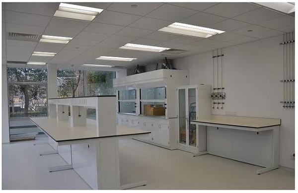 實驗桌臺面選擇時尚灰色實芯理化板, 是一種結構性材料, 不需粘貼在基材上就可單 獨使用, 相比于貼面型的耐蝕理化板, 不僅美觀, 而且更重要的是耐用。桌體和吊柜采用 三聚氰胺飾面板, 日暉色。安放天平的臺桌選用大理石臺面, 以達到穩(wěn)固的要求。實驗椅 選用可調式、帶腳圈、靠背, 適應不同高度的需求, 工作起來方便、舒適。此外, 設計之初考慮到新建實驗室今后的發(fā)展變化, 預留了一定的空間, 未將房內所有空間用于邊臺、吊柜 的放置, 這在后續(xù)的儀器設備購置和安放的工作實踐中證實, 這是非常必要的。